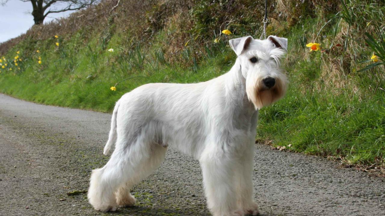 » Wallpaper White Schnauzer on the trail