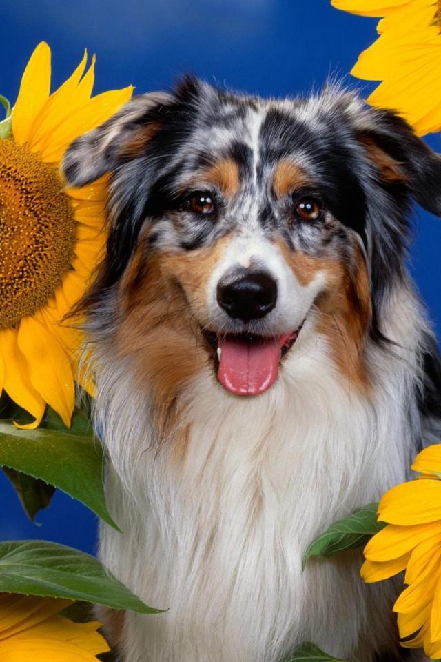 Wallpaper Collie puppy among sunflowers