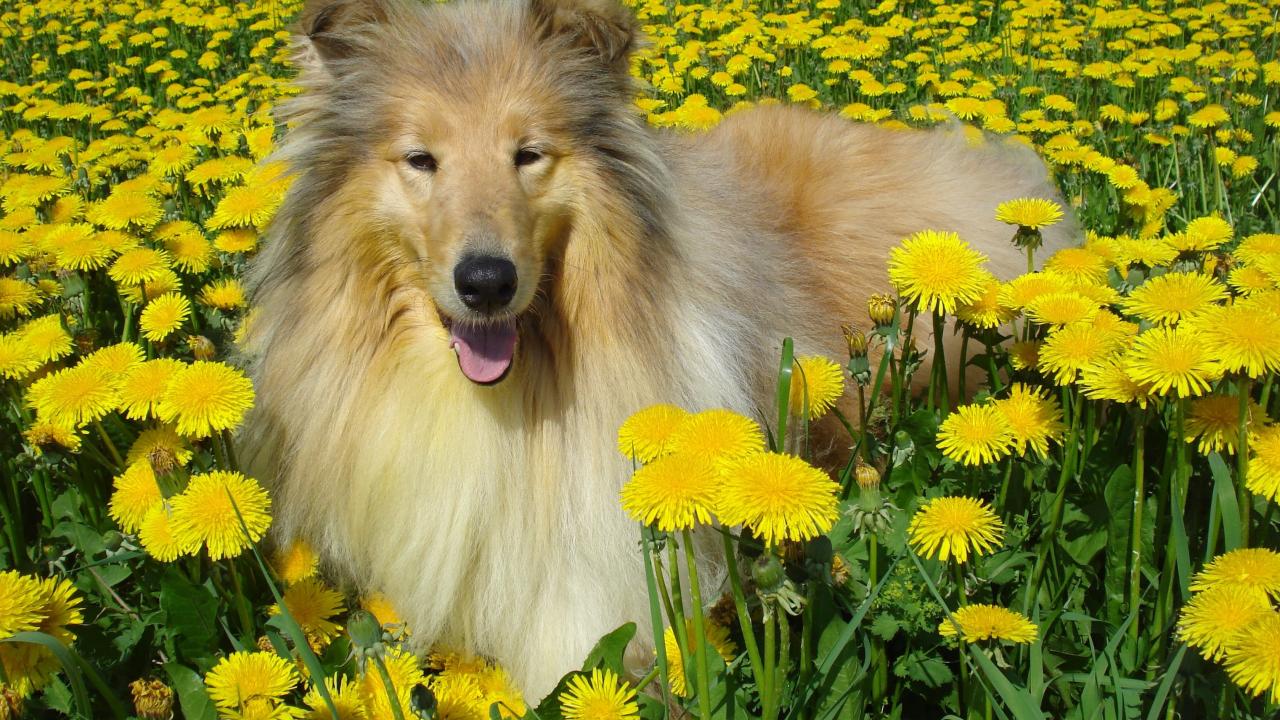 » Wallpaper Fluffy collie among dandelions