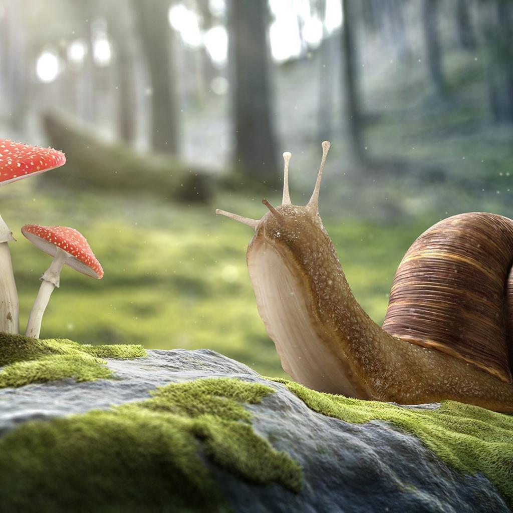 Wallpaper Snail and a pair of fly agaric on the mossy rocks