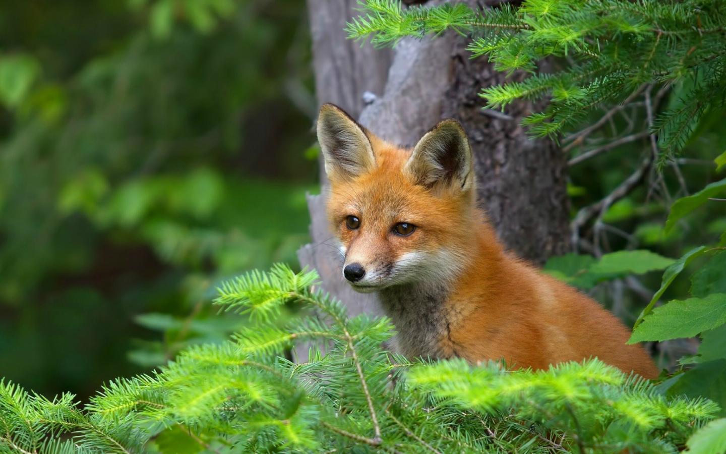 Wallpaper Fox in coniferous bushes
