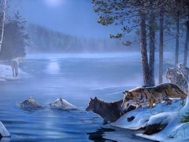 Wallpaper A pack of wolves moonlit night