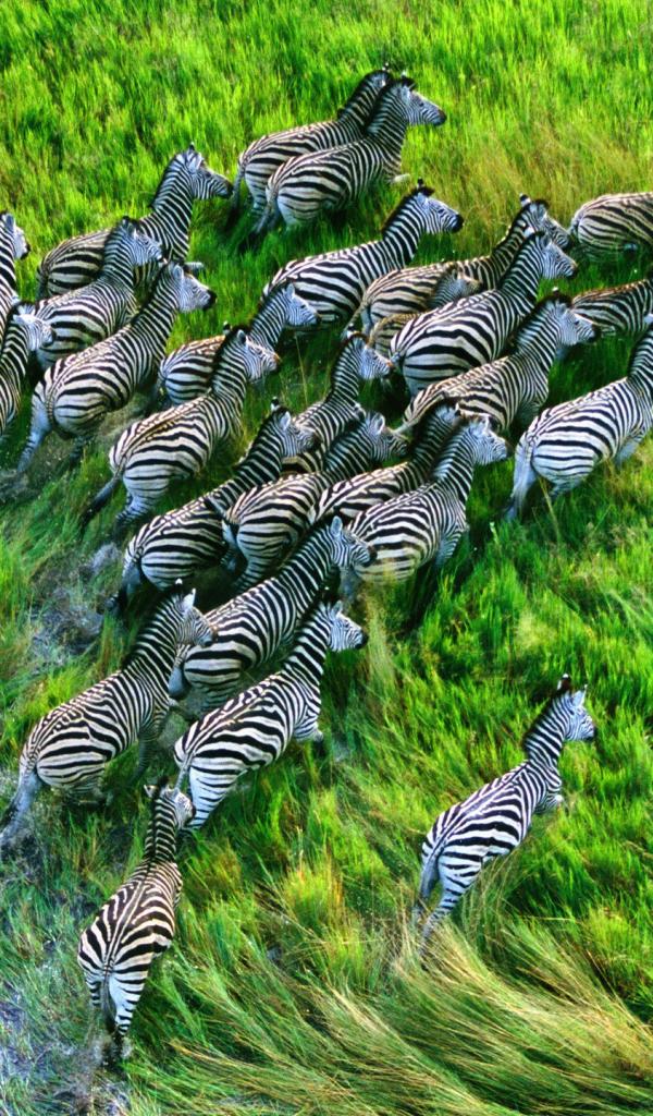 Wallpaper A herd of zebras running across the grass