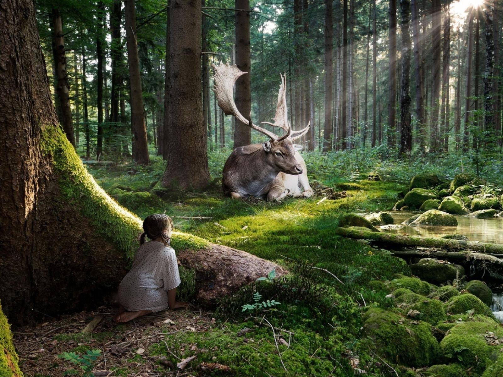 Wallpaper Trees, Little girl, Rays of the sun