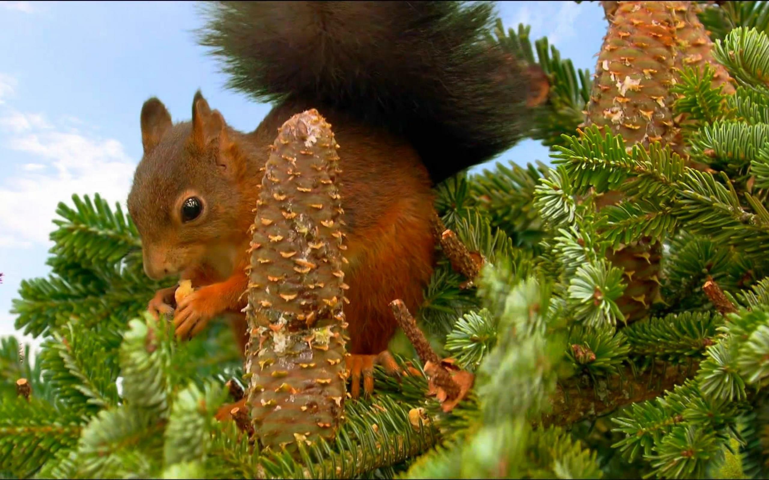 Wallpaper Squirrel collects cones on the tree