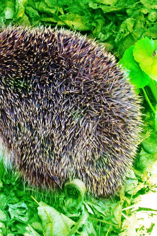 Wallpaper Hedgehog sitting on green leaves