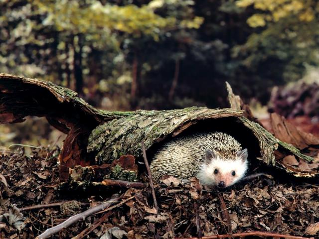 » Wallpaper Hedgehog under the bark of a tree